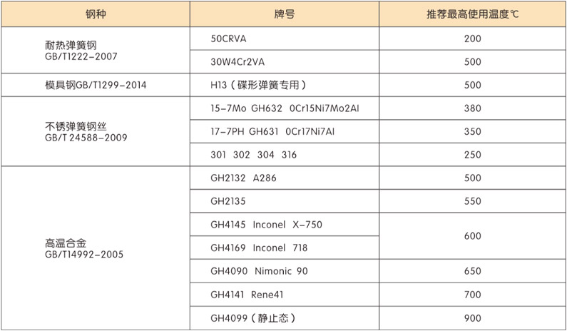 耐高溫(GH4169、GH4145、GH4090、GH4141、GH2132、GH2135),耐腐蝕合金(HC276、Inconel600、Inconel625、alloy 20、Monkel k500)鈦合金(TC4),彈性合金(3J21),不銹鋼(301、304、316、17-7PH、15-7Mo),碳鋼(65Mn、55Crsia、60si2MnA、50CRVA)