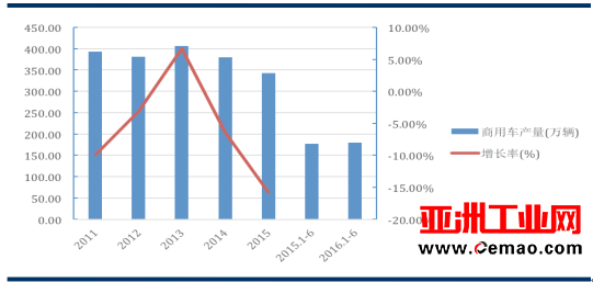 2011 年至 2016 年 1-6 月商用車產(chǎn)量及增長率情況如下: